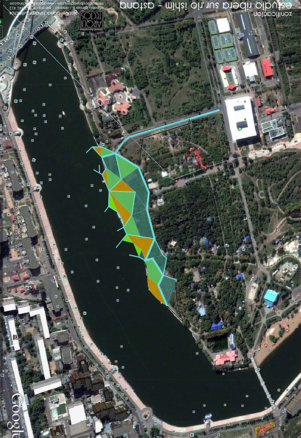 Se actúa sobre la margen del rio Ishim colindante con el parque, cuyo uso lúdico es de gran importancia en la ciudad.