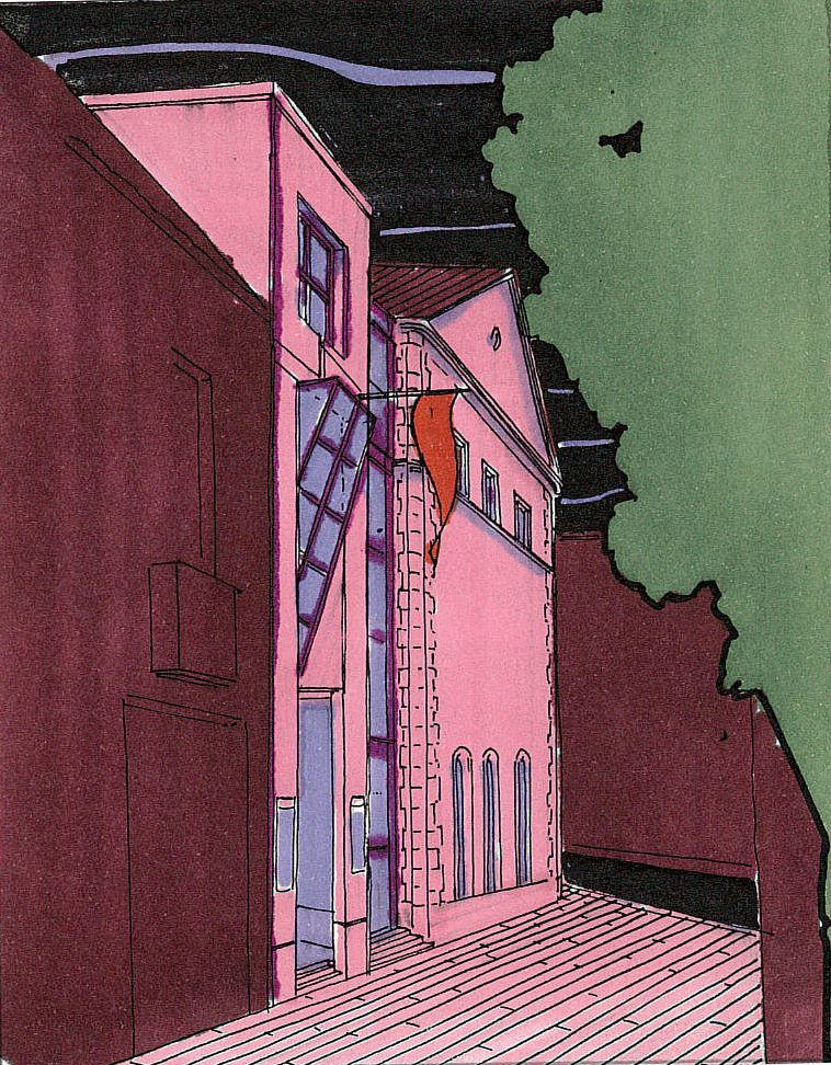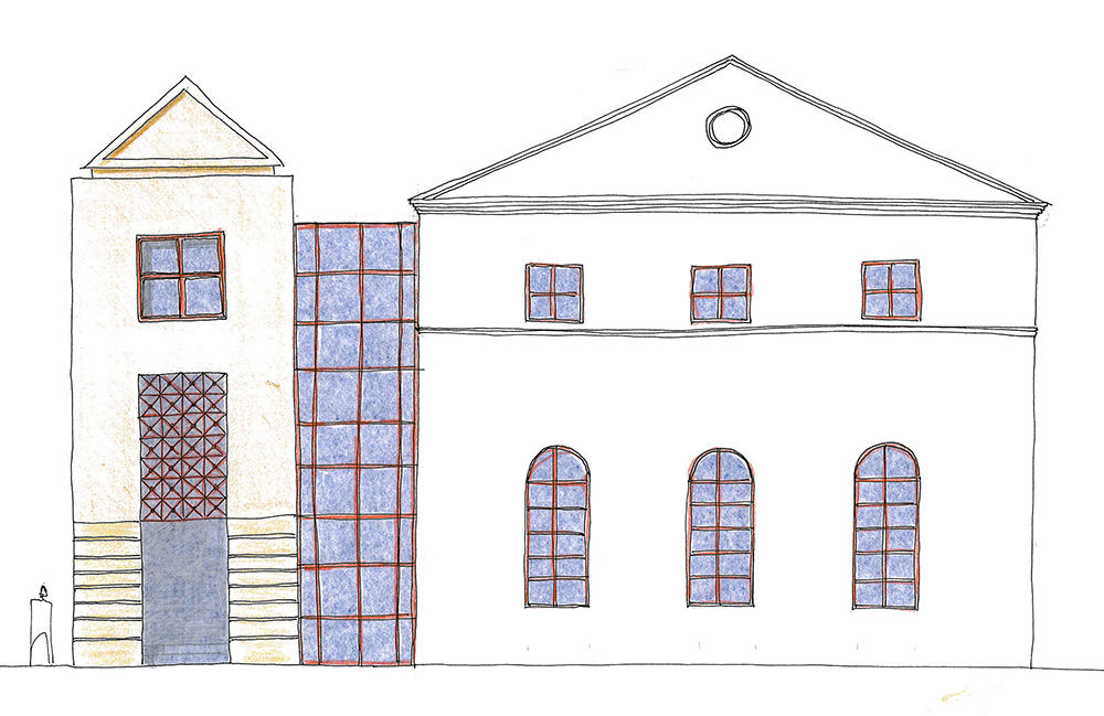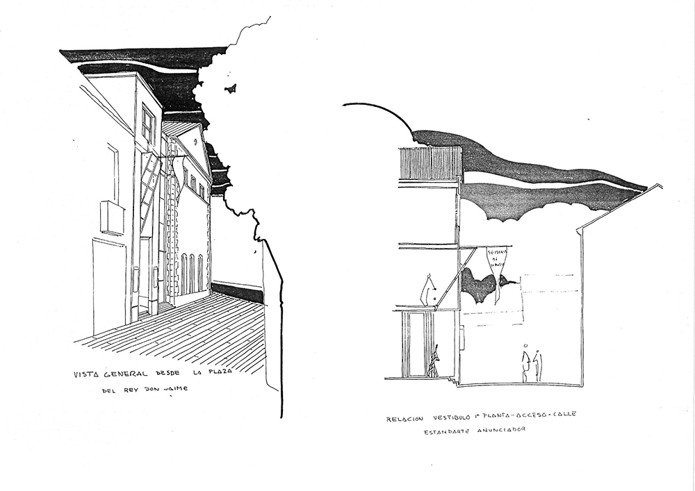 Recuperar la imagen del edificio de la sala de representaciones como volumen exento, jerarquizándolo frente al edificio de uso auxiliar. Para ello se le da la vuelta al paramento exterior formando esquina en lo que era medianera con la calle Cervantes, y se plantea un gran hueco vertical que lo separe del volumen medianero. Este hueco tiene una correspondencia con un patio cubierto interior que siga evidenciando el carácter de aislado.